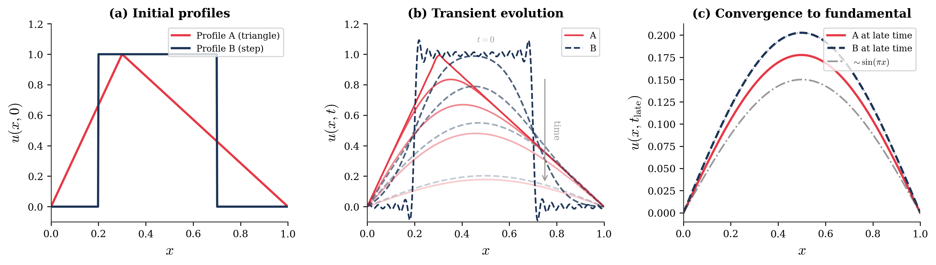 Consider two different initial profiles: a triangular peak centered at \(x = 1/2\), and a step function on \([1/4, 3/4]\). Both decompose into the same eigenfunctions, but with different coefficients \(c_n\). Their transient evolutions are visibly different — the step function develops Gibbs-like oscillations before smoothing, while the triangular peak decays more uniformly. Yet both converge to the same long-time behavior: exponential decay dominated by the slowest mode, \(c_1 \, e^{-\alpha\pi^2 t}\sin(\pi x)\). The intrinsic operator determines the landscape — which modes exist, which decay fastest, what the long-time limit looks like. The initial condition selects which path through that landscape is actually traversed.