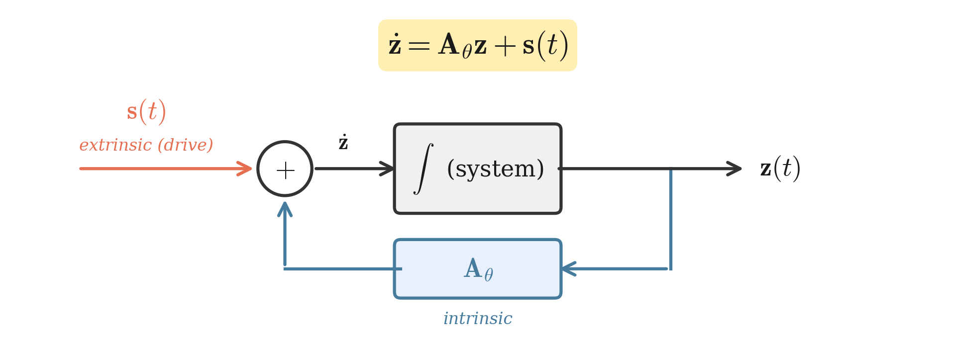 - \(\dot{\mathbf{z}} = \mathbf{A}_\theta \mathbf{z} + \mathbf{s}(t)\) at the matrix level,