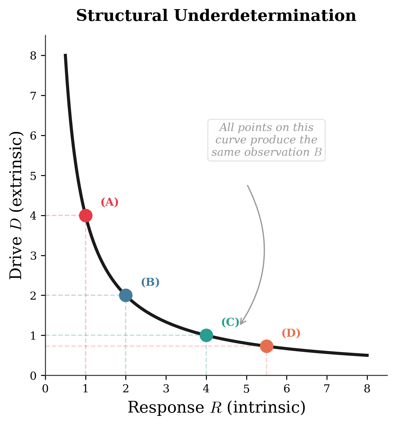 This interaction structure has direct epistemological consequences. Because the observable is generated by the joint action of intrinsic and extrinsic factors, behavior alone cannot uniquely resolve “how much was the response” versus “how much was the drive” without auxiliary assumptions; causal attributions are structurally underdetermined along a nature–nurture axis. The individual ingredients of this framework — constitutive laws and linear response theory (Onsager 1931), bond-graph power conjugacy (Paynter 1961; Karnopp, Margolis, and Rosenberg 2012), evolution equations on function spaces (Pazy 1983), and identifiability analysis — are each well established. What this work contributes is a unifying narrative: a continuous logical arc from the constitutive-law observation through cross-domain analogies and operator-form PDEs to a formal demonstration that the interaction structure implies structural underdetermination of causal attributions at every level.
