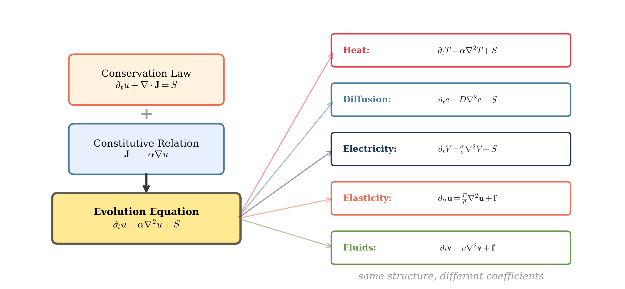 The conservation law is always the same abstract statement: “the rate of change equals the net inflow plus sources.” What distinguishes one field from another is the constitutive relation — the specific form of the Response × Drive product. The material coefficient (conductivity, diffusivity, stiffness, viscosity) encodes the system’s intrinsic character; the gradient or field encodes the extrinsic drive. The evolution coefficient — obtained by combining the constitutive parameter with material density or capacity — is the quantity that actually governs the dynamics. For heat, diffusion, and fluids, this coefficient carries units of m²/s and sets the rate at which spatial gradients smooth out; for electricity it is a relaxation rate; for elasticity it is a squared wave speed.